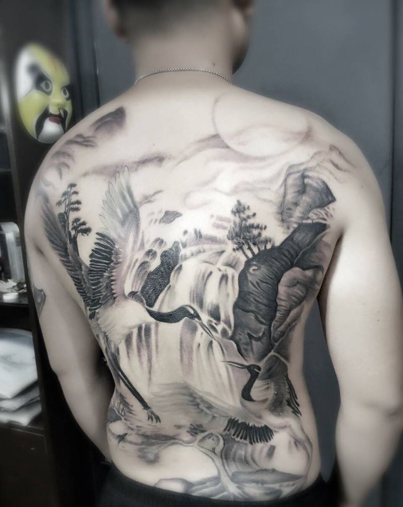 松鹤山水未完成纹身图片_成品背部传统清新动物植物静物纹身图案