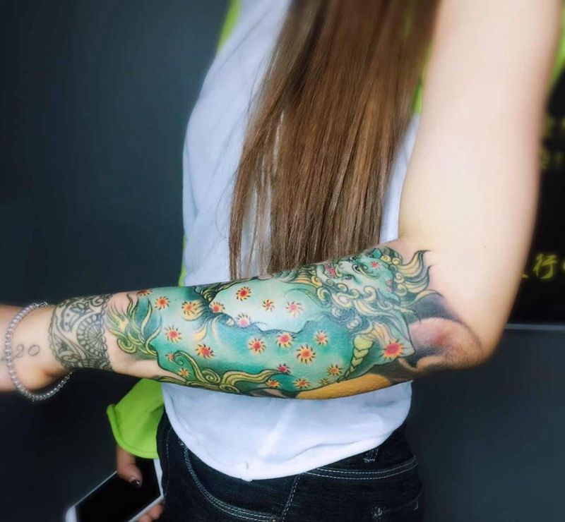 当前位置: 首页 >江苏省苏州市纹身店-苏州夜行堂纹身馆纹身图案>唐狮纹身图片_成品手臂传统鬼神纹身图案