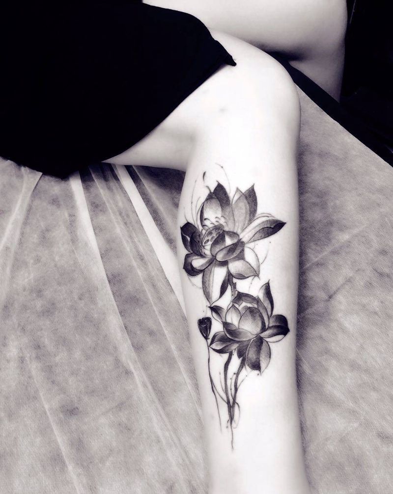 水墨莲花纹身图片_成品腿部传统字符纹身图案