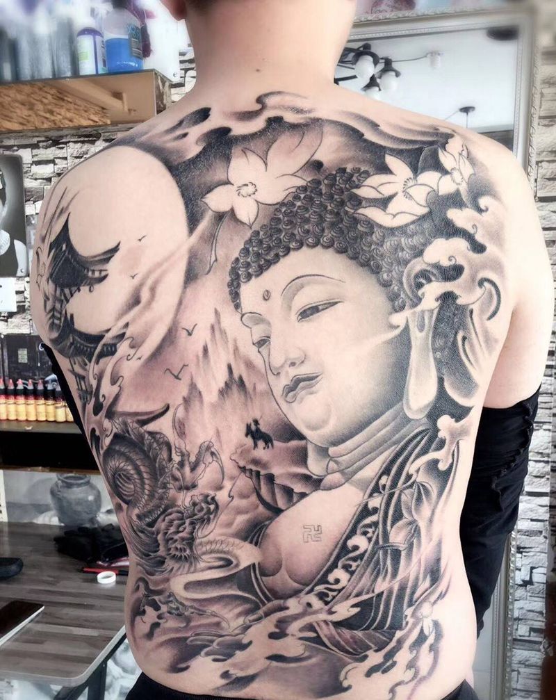 当前位置: 首页 >江苏省苏州市纹身店-苏州夜行堂纹身馆纹身图案>满背佛纹身图片_成品背部传统肖像鬼神人物纹身图案