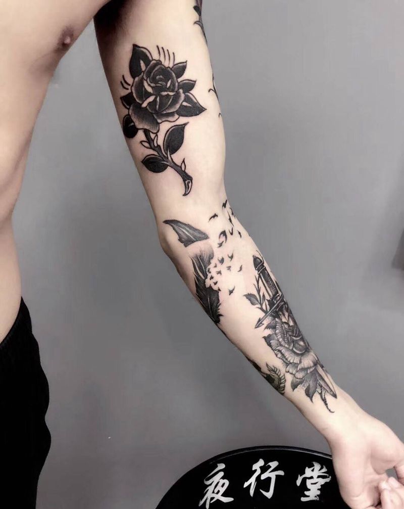 拼接花臂纹身图片_成品手臂欧美清新植物动物原创花臂纹身图案