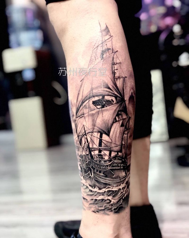 船纹身图片_成品腿部欧美写实几何帆船纹身图案