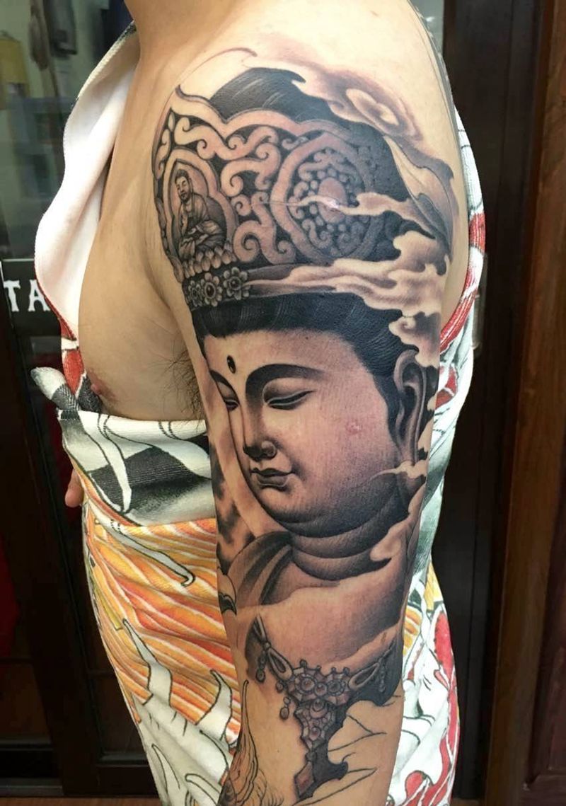 文殊菩萨花臂未完纹身图片_成品手臂传统宗教鬼神纹身图案