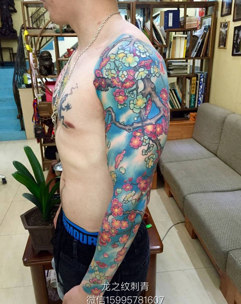 梅花花臂恢复两年,胸前继续。纹身图片_成品手臂国画植物原创龙之纹刺青纹身图案