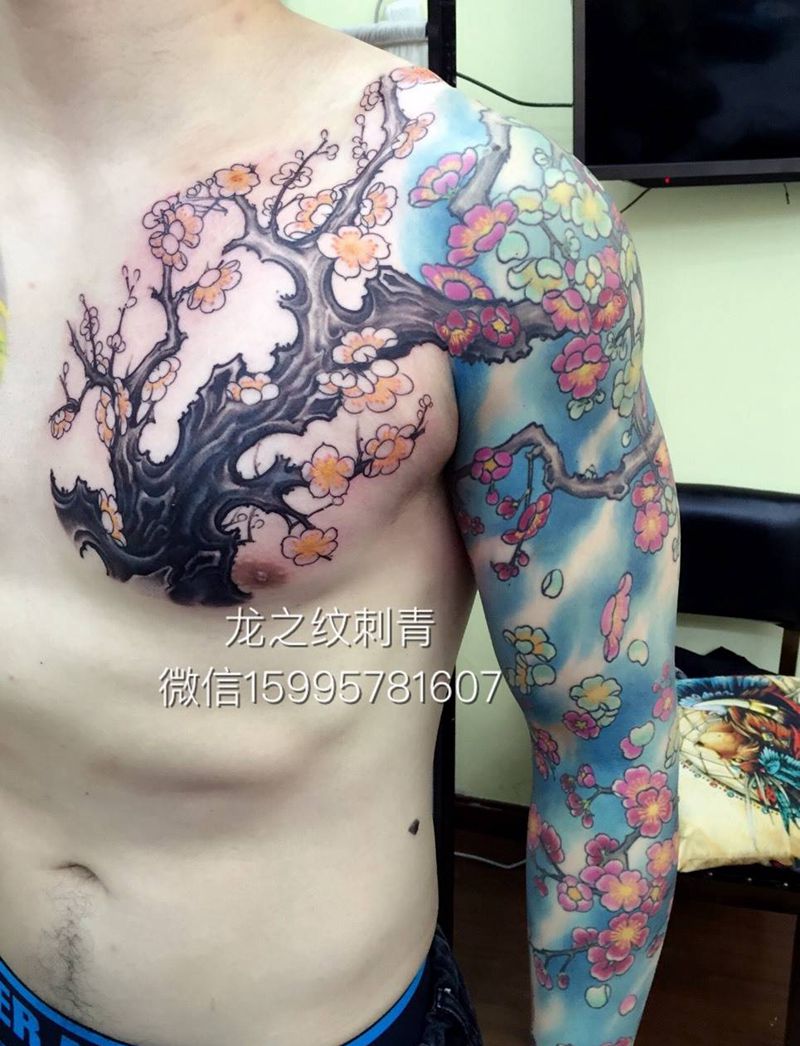 梅花花臂恢复两年,胸前继续。纹身图片_成品手臂国画植物原创龙之纹刺青纹身图案