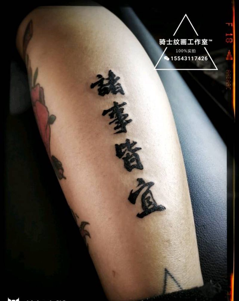 百无禁忌 诸事皆宜纹身图片_腿部国画字符图腾原创成品纹身图案