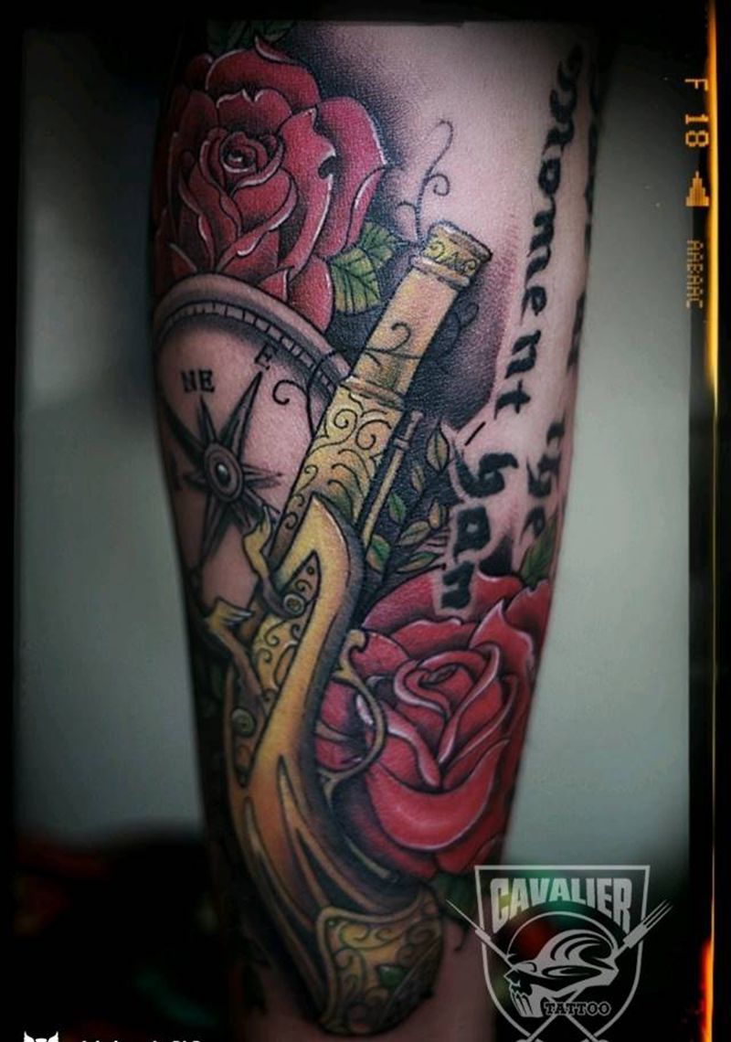 枪花纹身图片_腿部欧美静物成品纹身图案