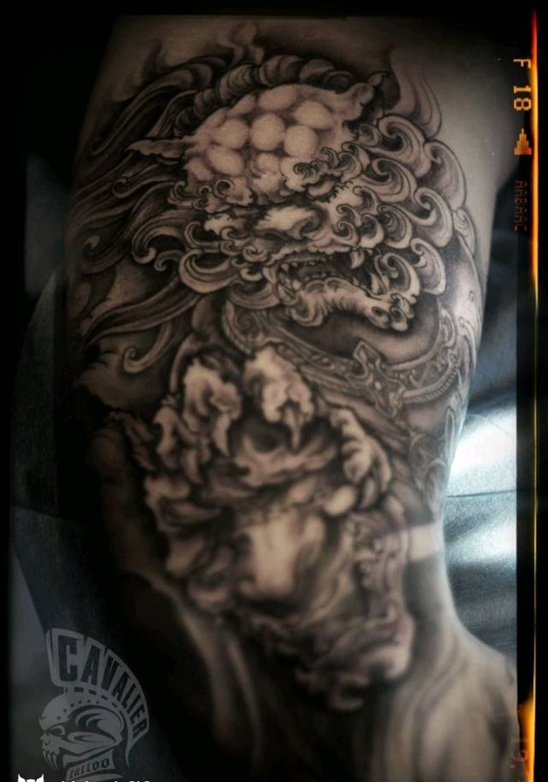 当前位置: 首页 >江苏省苏州市纹身店-骑士纹画纹身图案>唐狮上色完成纹身图片