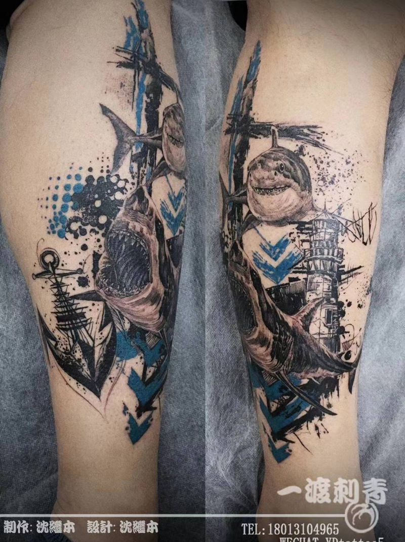 当前位置: 首页 >江苏省苏州市纹身店-苏州一渡刺青纹身馆纹身图案>鲨鱼纹身图片_腿部水墨New School纹身图案