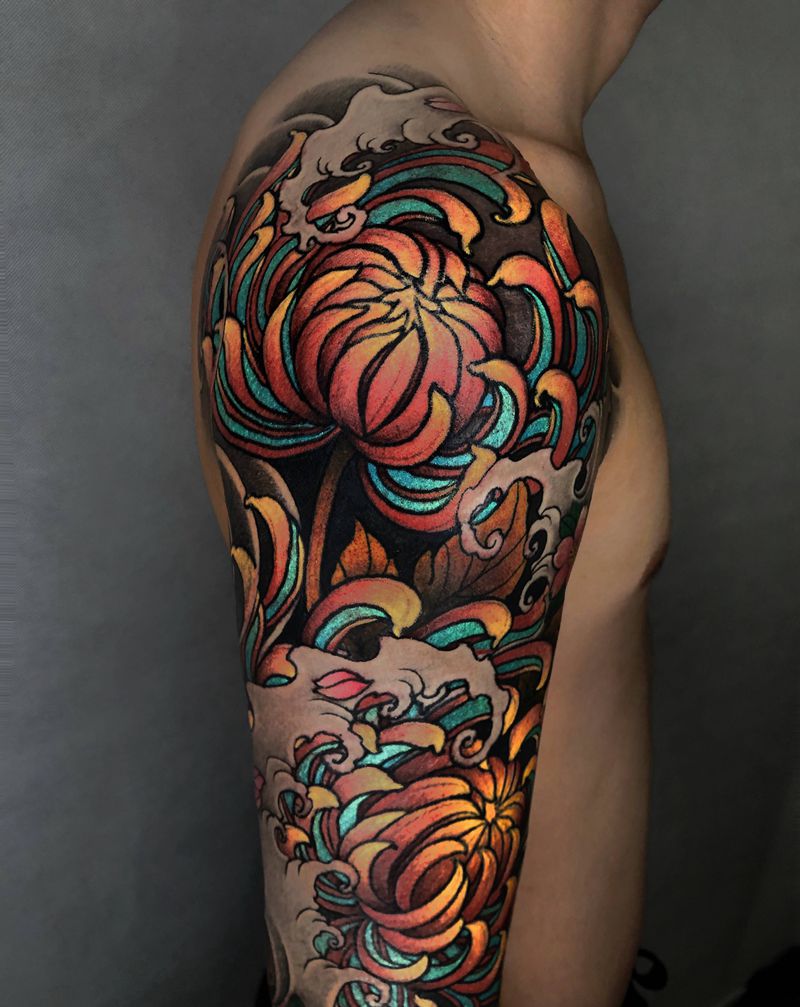 新传统大臂菊花纹身图片_手臂新传统纹身图案