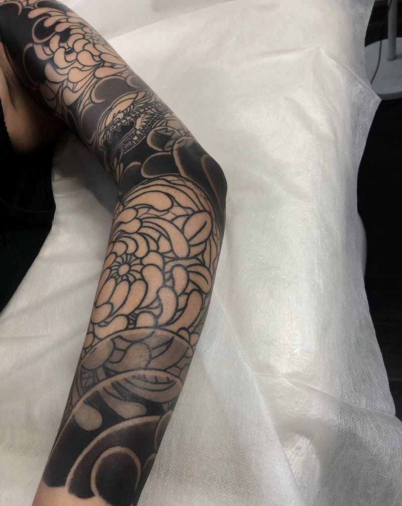 当前位置: 首页 >江苏省苏州市纹身店-谛酉刺青纹身图案>老传统牡丹花臂蛇40%纹身图片_手臂老传统纹身图案