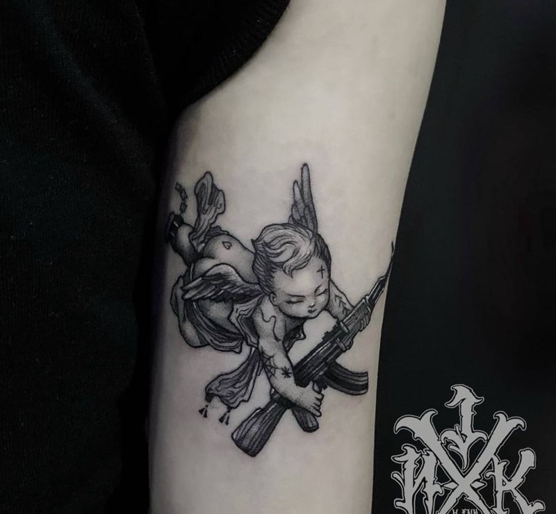 大臂内侧 暗黑 小天使纹身图片_手臂New School欧美写实暗黑天使枪纹身图案