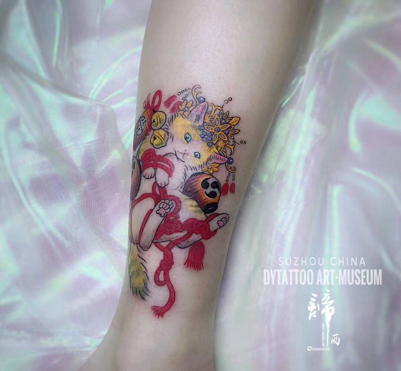 招财猫纹身图片_腿部脚部New School水彩纹身图案