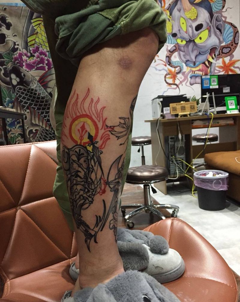 • T网红王老大花腿龙纹身图片_腿部新传统纹身图案