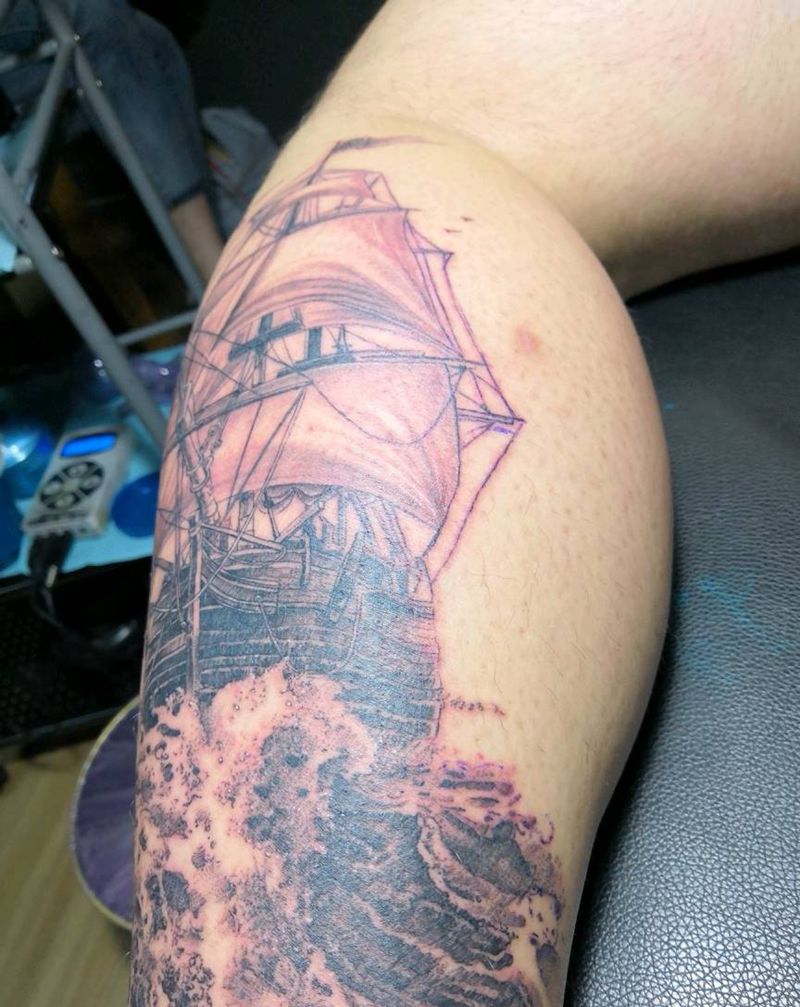 又双叒见帆船纹身图片_腿部欧美写实帆船成品纹身图案