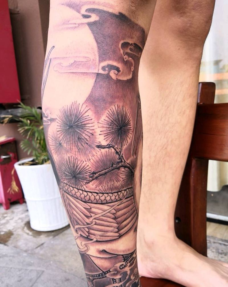 • T网红王老大花腿龙纹身图片_腿部新传统纹身图案