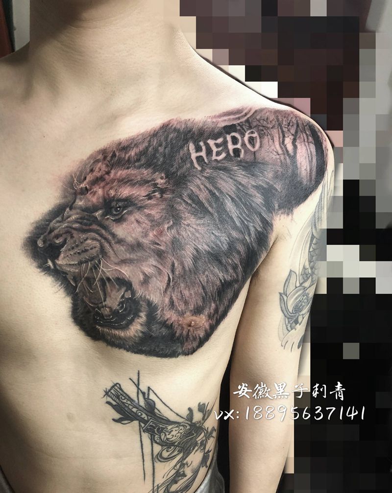 狮子纹身图片_胸部肩部欧美写实纹身图案