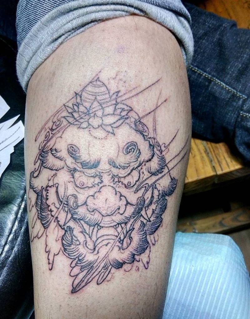 唐狮纹身图片_腿部传统动物宗教成品纹身图案
