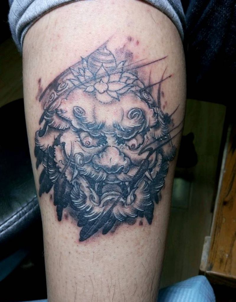 唐狮纹身图片_腿部传统动物宗教成品纹身图案