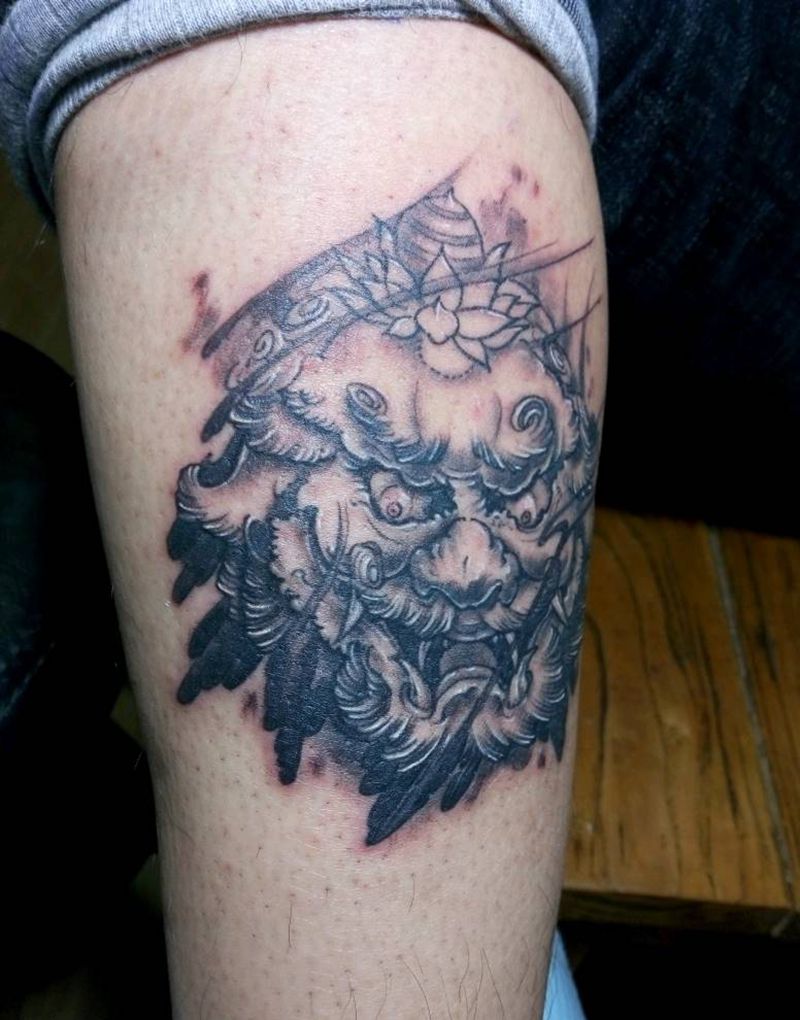 唐狮纹身图片_腿部传统动物宗教成品纹身图案