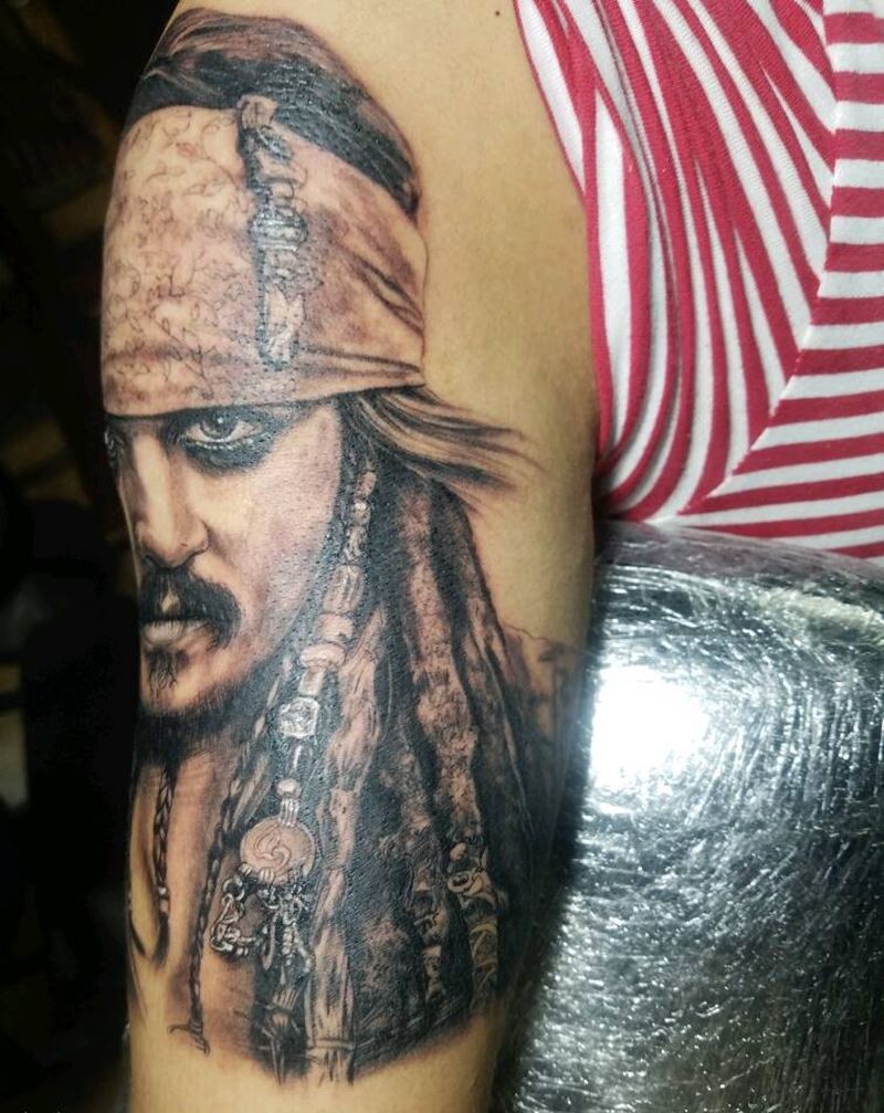 杰克船长纹身图片_肩部欧美肖像写实人物成品纹身图案