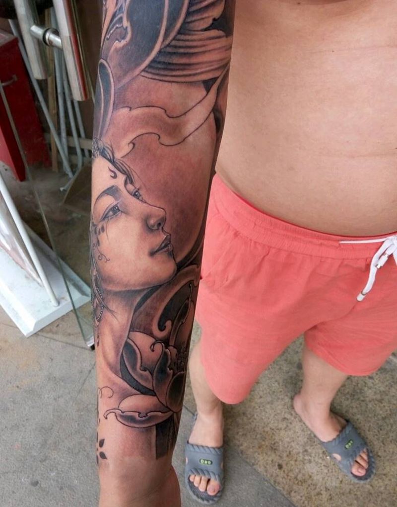 当前位置: 首页 >江苏省苏州市纹身店-鬼舞刺青·旗舰店纹身图案>鲤鱼艺伎纹身图片_肩部手臂传统肖像动物人物成品纹身图案