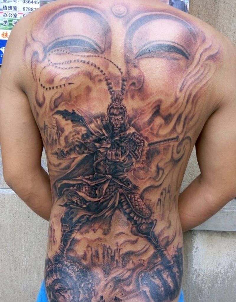 满背大圣纹身图片_背部传统宗教成品纹身图案