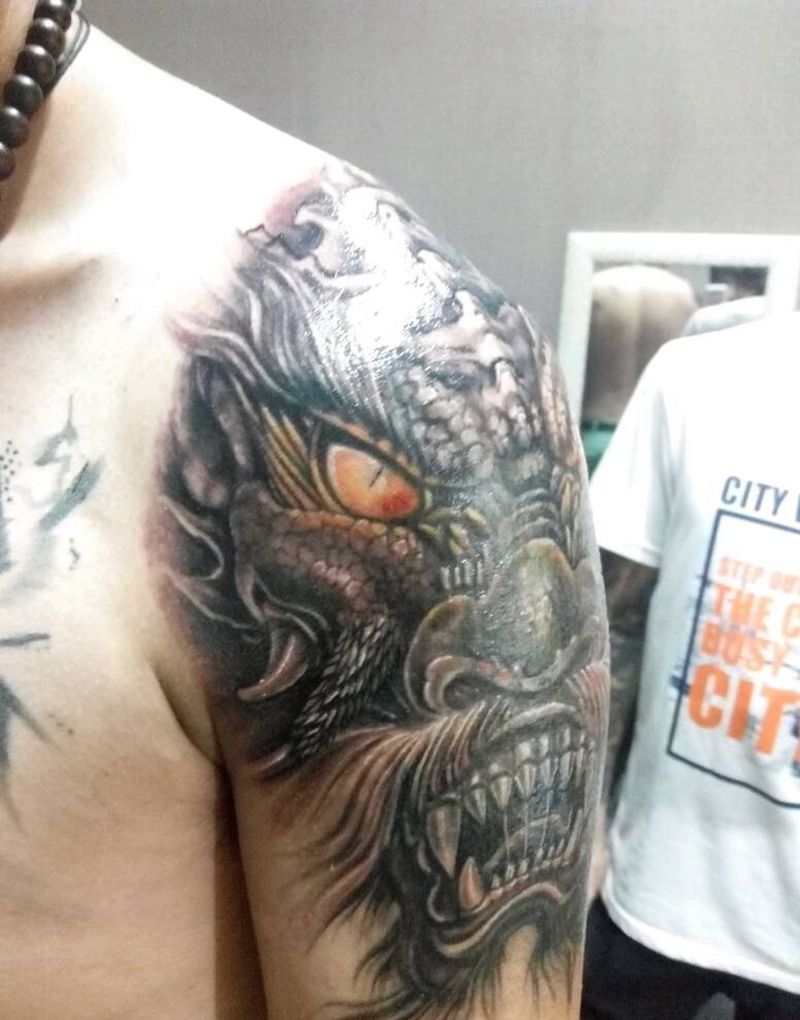 邪龙遮盖纹身图片_肩部传统动物宗教成品纹身图案