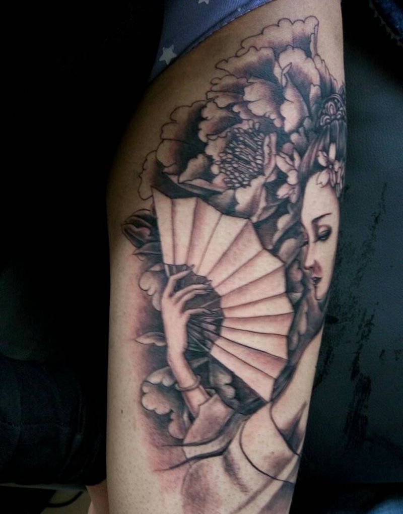 艺妓纹身图片_腿部传统肖像写实国画人物原创成品纹身图案