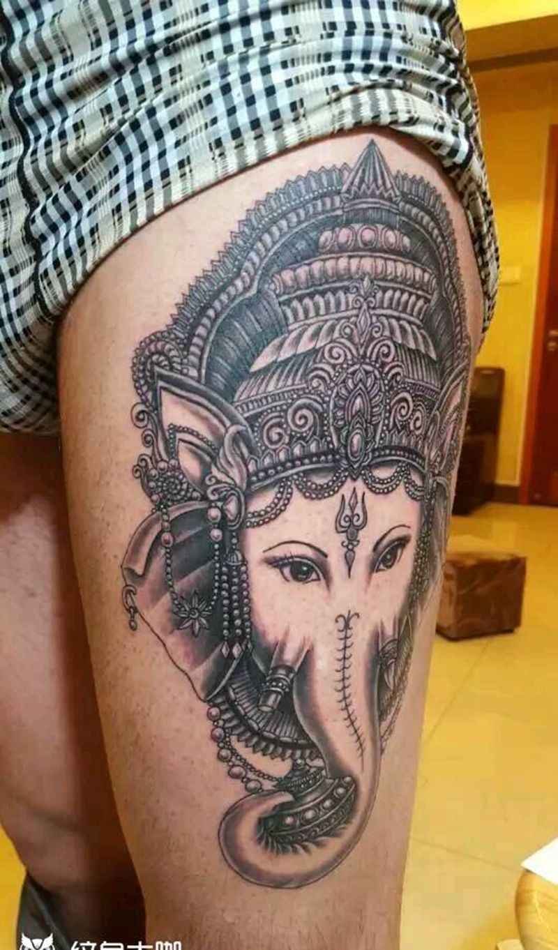 象神纹身图片_腿部传统鬼神成品纹身图案