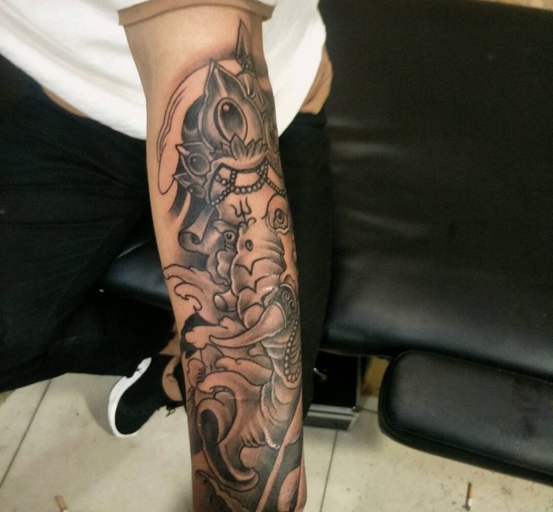 当前位置: 首页 >江苏省苏州市纹身店-兄弟纹身馆(吴中分店)纹身图案>象神纹身图片_手臂传统动物成品纹身图案