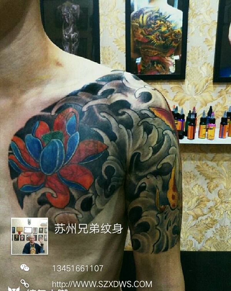 当前位置: 首页 >江苏省苏州市纹身店-兄弟纹身馆(吴中分店)纹身图案>半甲遮盖纹身图片_肩部胸部传统动物植物图腾成品纹身图案