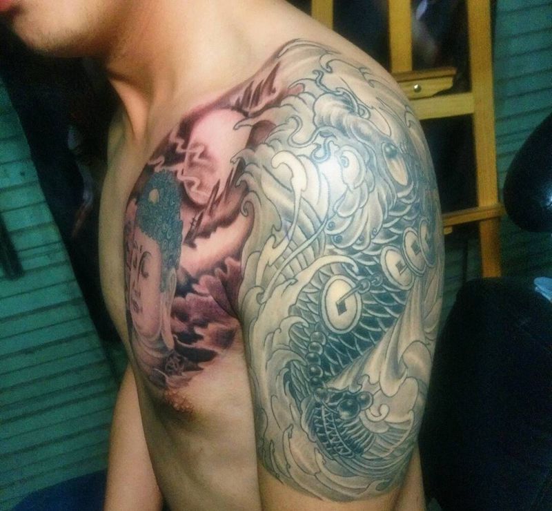 佛鱼半甲纹身图片_肩部胸部传统成品纹身图案