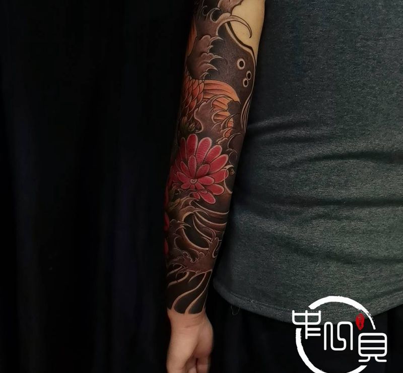 当前位置: 首页 >江苏省苏州市纹身店-苏州中一贝刺青工作室纹身图案>传统锦鲤纹身图片_手臂老传统纹身图案