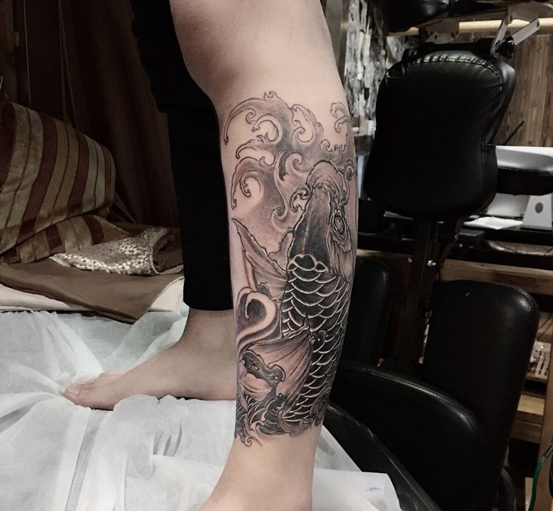• T网红王老大花腿龙纹身图片_腿部新传统纹身图案