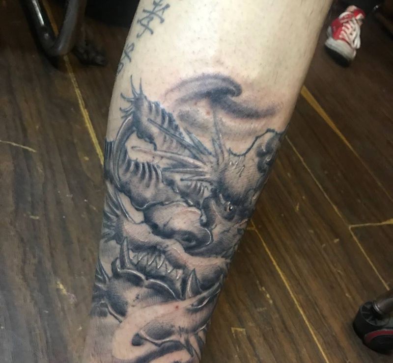 • T网红王老大花腿龙纹身图片_腿部新传统纹身图案