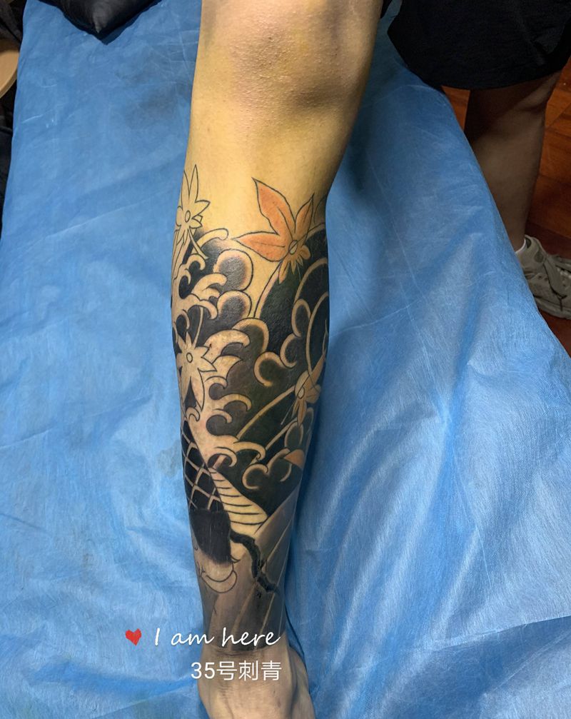 • T网红王老大花腿龙纹身图片_腿部新传统纹身图案