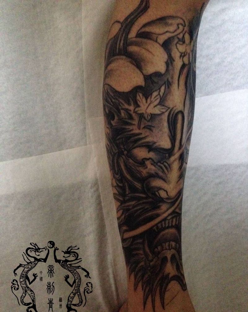 • T网红王老大花腿龙纹身图片_腿部新传统纹身图案