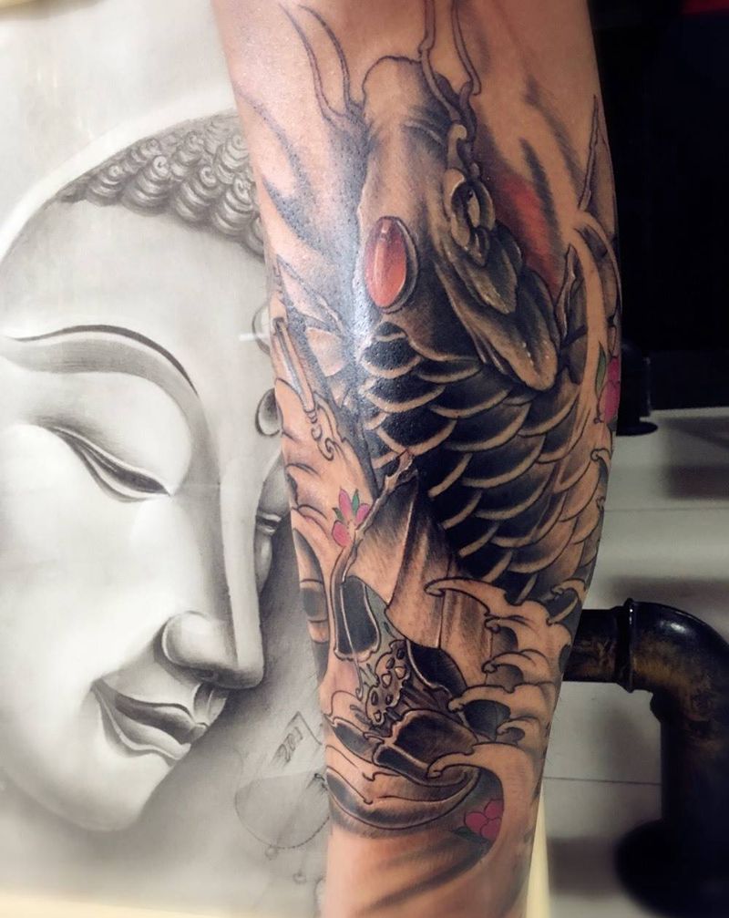 小腿富贵鱼纹身图片_成品腿部传统动物纹身图案