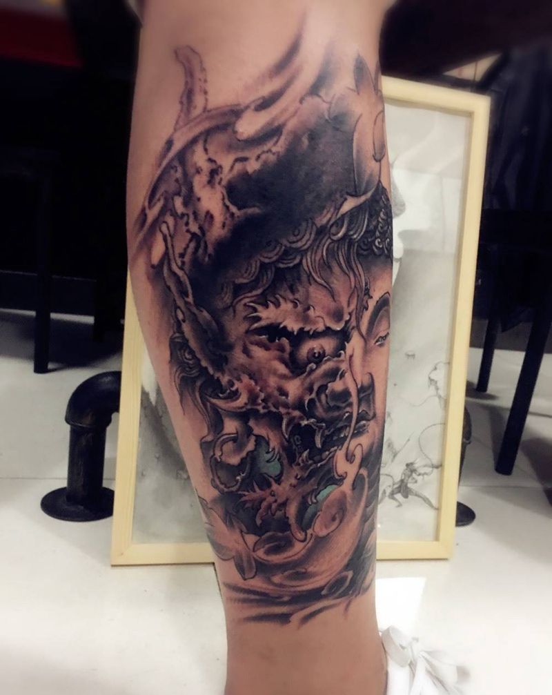 当前位置: 首页 >江苏省苏州市纹身店-昆山洪.纹刺纹身店纹身图案>小腿 一念纹身图片_成品腿部传统人物纹身图案