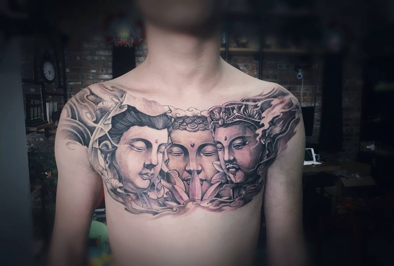 花胸 三面佛纹身图片_胸部新传统纹身图案
