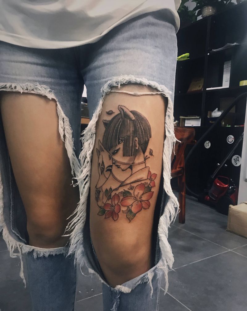 大腿艺伎纹身图片_腿部新传统纹身图案