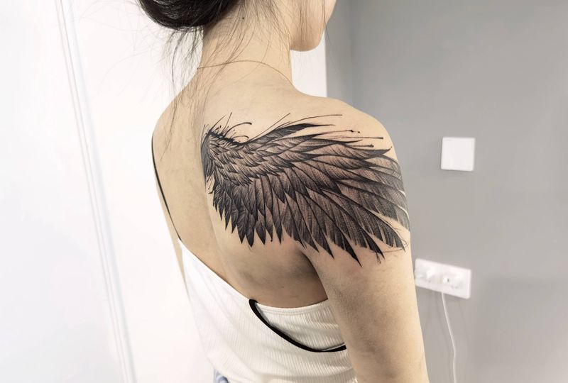 翅膀遮盖纹身图片_背部肩部点刺欧美写实纹身图案