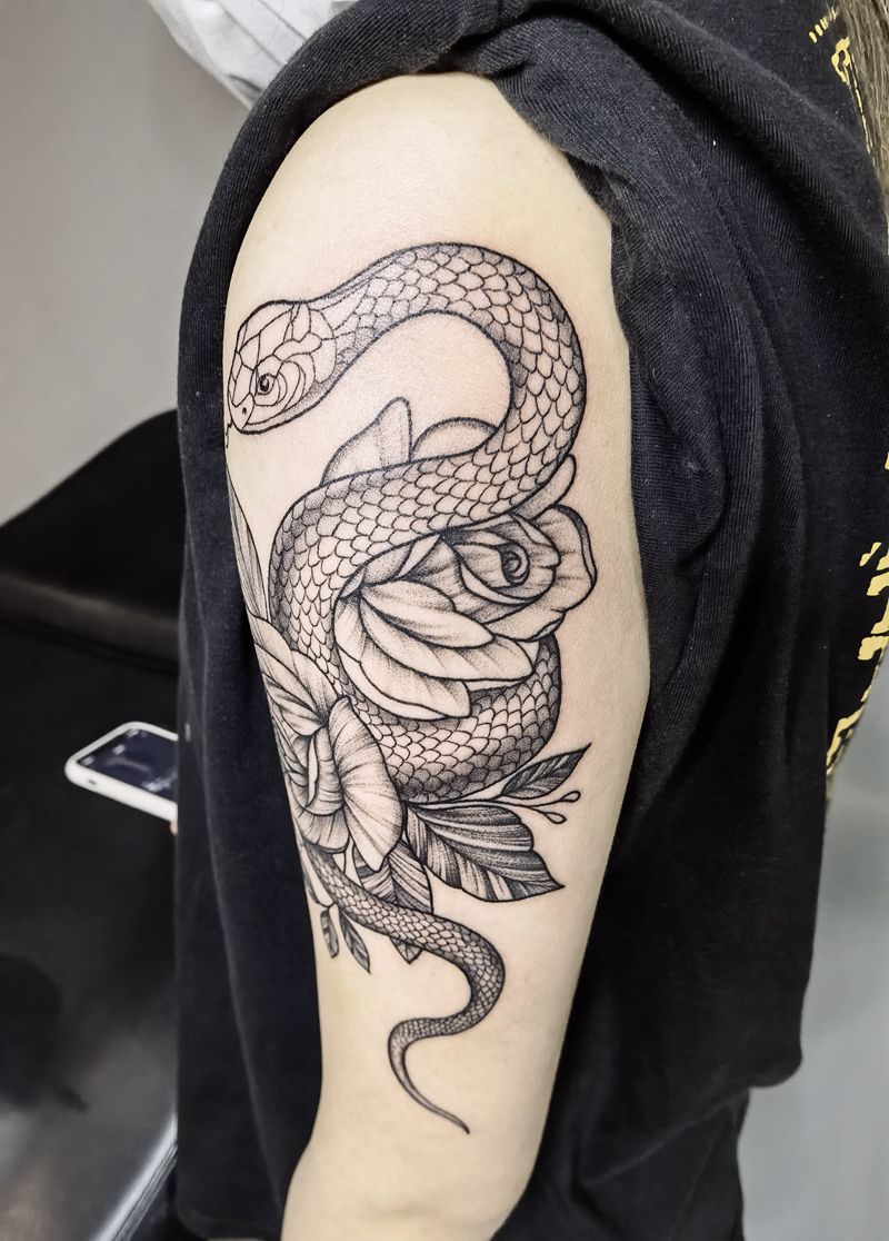 当前位置: 首页 >江苏省苏州市纹身店-太仓瀚源刺青纹身图案>蛇纹身图片_肩部点刺New School纹身图案
