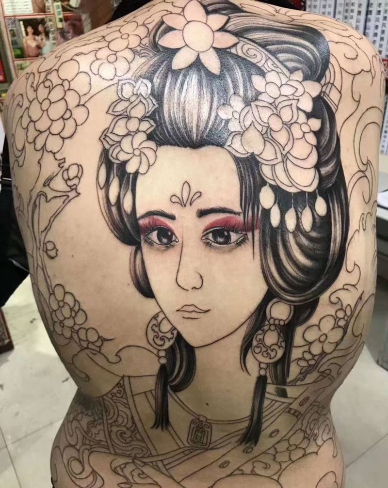 大后背艺伎刺青纹身图片_背部新传统水墨艺伎刺青纹身图案
