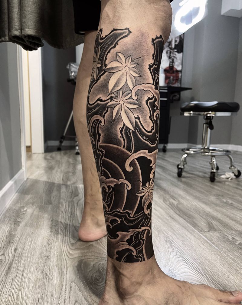 • T网红王老大花腿龙纹身图片_腿部新传统纹身图案