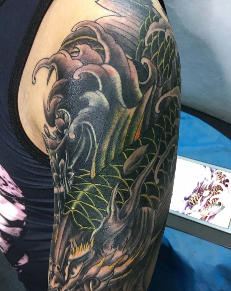 • T网红王老大花腿龙纹身图片_腿部新传统纹身图案