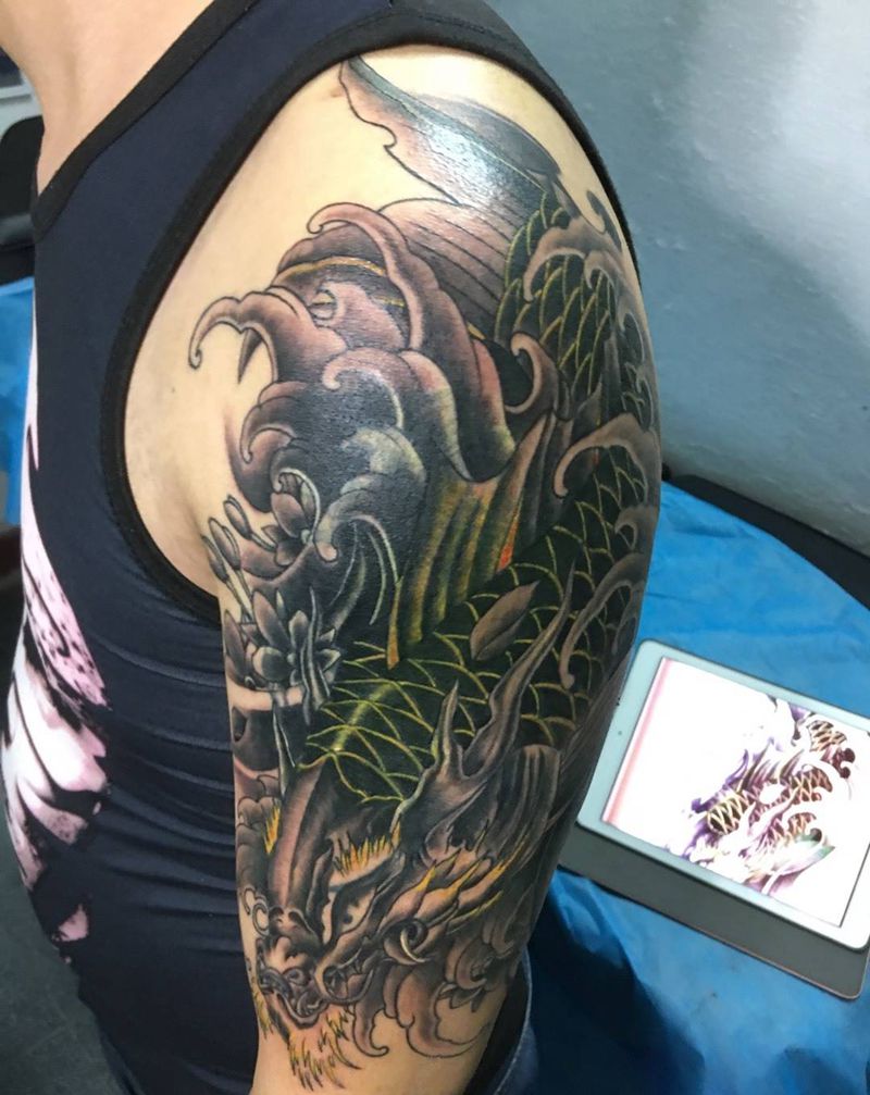 • T网红王老大花腿龙纹身图片_腿部新传统纹身图案
