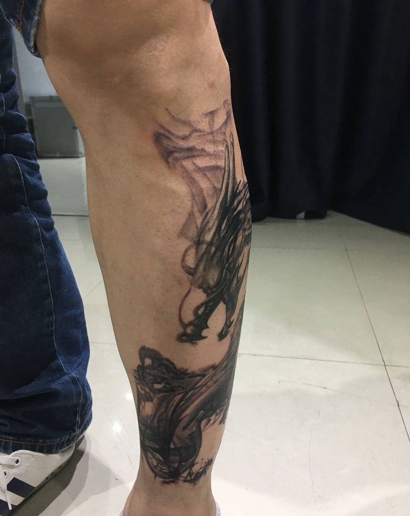 • T网红王老大花腿龙纹身图片_腿部新传统纹身图案