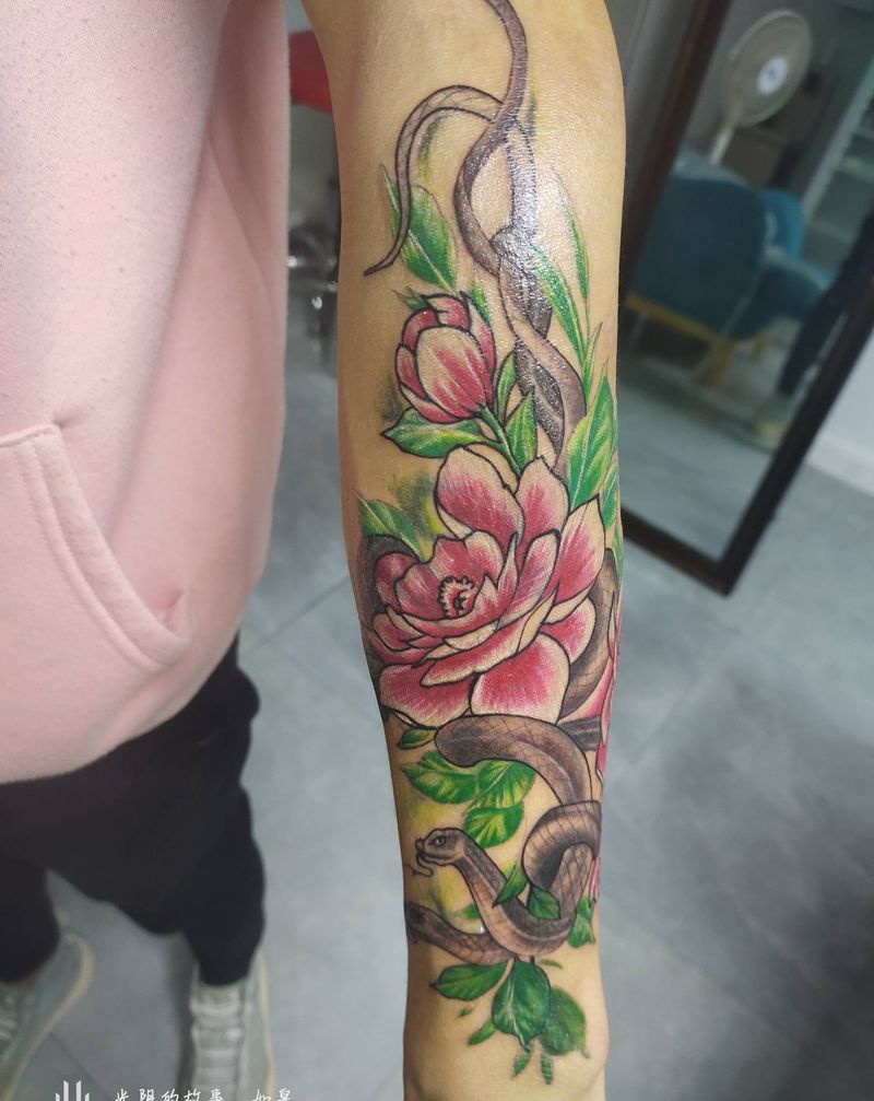 本来是小清新线条客人要求上色纹身图片_手臂手部新传统New School花,蛇纹身图案